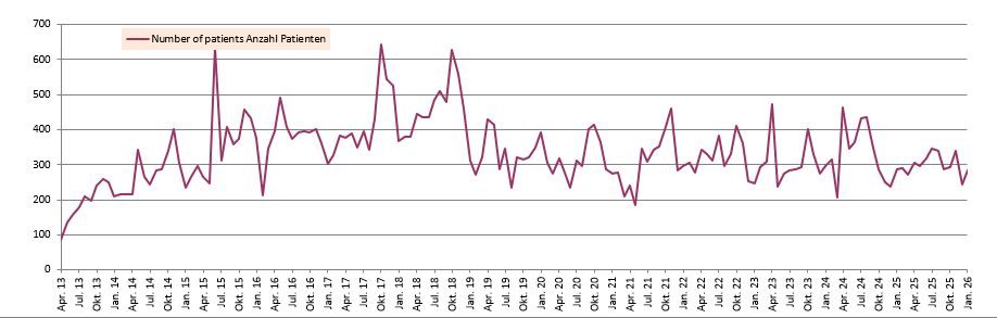 Durch besondere Umstände gibt es temporäre Anstiege in einer ansonsten im Mittel gleichbleibenden Kurve mit ca. 350 Patienten pro Monat. Diese besonderen Umstände können z.B. die jährliche Monsunzeit sein, in der es auf Grund der verschlammten Wege oft zu Unfällen kommt. Natürlich lassen solche Ereignisse wie das Erdbeben 2015 die Kurve ebenfalls sprunghaft ansteigen.
